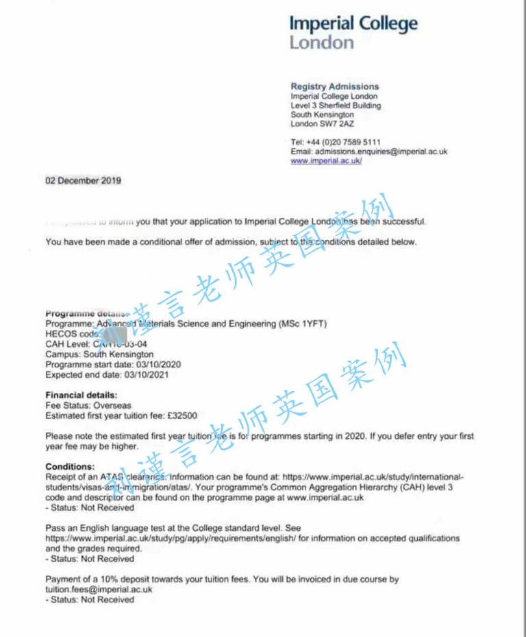 帝國理工錄取案例:高級材料科學與工程碩士,無雅思提前錄取