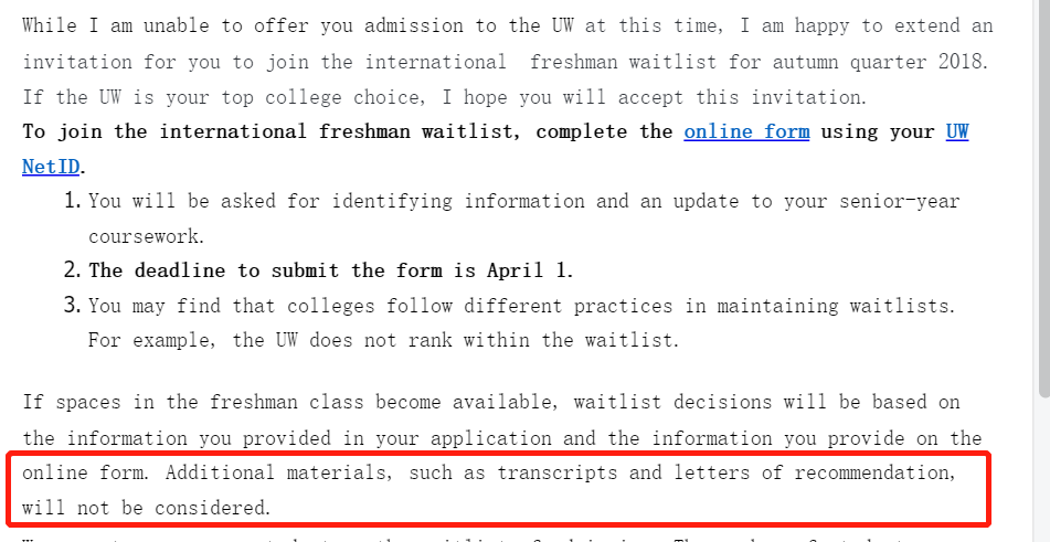 然而,還有些學校并不接受補充材料。比如北卡教堂山,就在waitlist letter中明確指出,他們對申請者的審核主要還是依據先前的申請和最終成績單,并不推薦學生發送額外的材料。還有些學校,比如CMU,UW,也會給學生發郵件強調,他們只接受申請時遞交的信息,除此之外不接受任何其他的材料。
